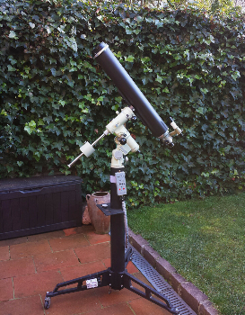 Così ho riesumato una vecchia montatura Super Polaris, completamente sistemata (smontata, pulita, ingrassata nuovamente, e con la parte elettronica e di motorini interamente revisionata) e dotata di una colonna in acciaio inox e gambe con ruote per il rapido spostamento.