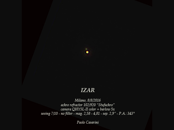Sebbene non faccia notizia la sua facile separazione, attualmente prossima ai 5” con componenti di magnitudo 1,9 e 2,9 circa rispettivamente, devo però soffermarmi a sottolineare quanto pulita apparisse l’immagine fornita dal 4 pollici acromatico. La coppia (in realtà il sistema è formato anche da altri astri legati gravitazionalmente alle componenti A e B benché la loro luminosità sia notevolmente inferiore) risultava largamente separata a 230x con due dischi di Airy ben rotondi e puliti circondati da un primo anello di diffrazione e da un accenno, debolissimo, di secondo.