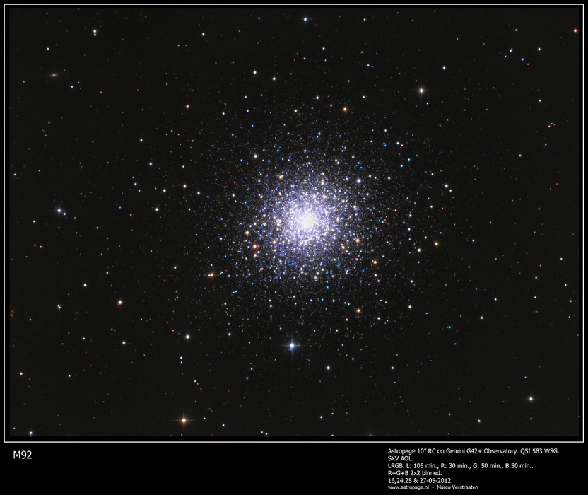 M92 risulta impressionante in entrambi gli strumenti. Complice la trasparenza eccezionale del cielo e l'oscurità assoluta il globulare appare quasi interamente risolto anche se l'immagine migliore resta ad appannaggio del binoscopio. Più stelle nell'alone, più luminosità generale, maggiore godibilità e relax di osservazione, nucleo interno più sgranato. Ho usato su entrambi gli strumenti gli ingrandimenti che preferisco, ovvero quelli forniti dal SWA 13,8 sul Vixen e la coppia di plossl da 15 mm. Sul binoscopio.