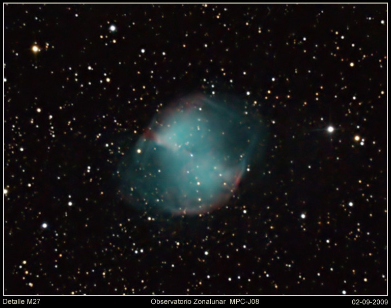 M27, come sempre dico, è un oggetto difficile. Appare luminosissimo in entrambi gli strumenti (con un certo vantaggio per il binoscopio che lo mostra ancora più appariscente). La clessidra tradizionale si perde ed emergono in entrambi gli strumenti le porzioni di nebulosità di riempimento che si spingono come ulteriori cuspidi all'esterno. Non noto in nessuno dei due la stellina centrale, come peraltro ovvio, ma scorgo alcune debolissime stelline di fondo attraverso le zone meno dense e più periferiche della nebulosa.