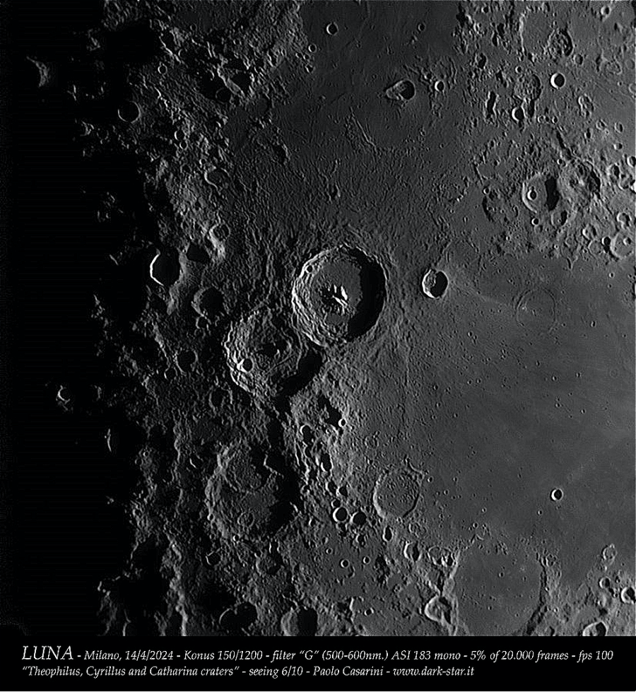 Il Konus, forse anche in virtù del viraggio “caldo”, nasconde bene il pur visibile spettro secondario che si tende a notare più sul lembo lunare che non nelle ombre proiettate al terminatore dai