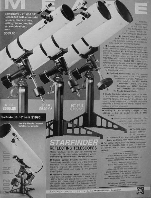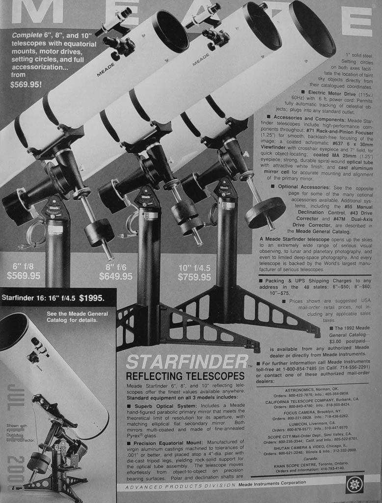 La storia della Meade, a ragione o a torto una delle più influenti marche di telescopi amatoriali attraverso periodi di luci e di ombre, è di diritto entrata nella cultura di base degli astrofili “moderni”, dall’era dei primi Schmidt Cassegrain fino alla produzione odierna.
