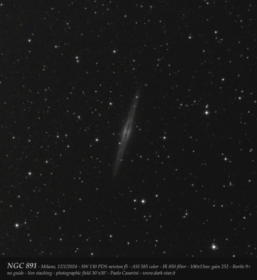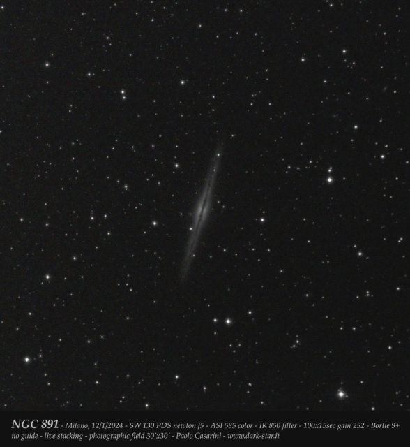 La prima immagine ritrae la galassia NGC 891 con pose di 15 secondi sommate in numero di 100, con una
