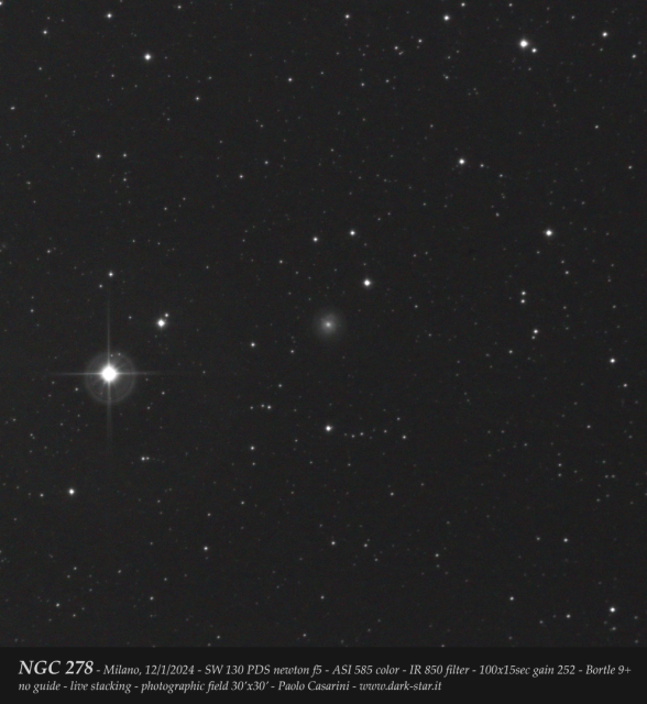 La seconda immagine è dedicata alla galassia NGC 278, facile da rilevare per quanto riguarda il bulge centrale ma decisamente più ostica nel mostrare i suoi bracci a spirale.