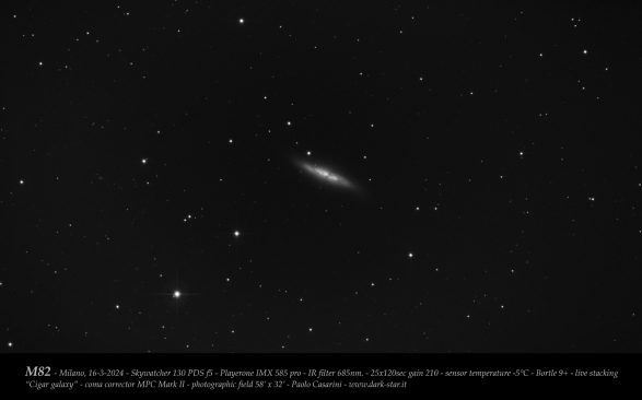 Una tra tutte ho scelto di condividere una prova sulla "solita" M82, immagine molto poco esaltante date le condizioni di umidità e "cielo scuro", che nella notte di ripresa era un Bortle 9+ con nuvole. Le condizioni mi hanno fermato a 50 minuti di integrazione (25 pose da 120 secondi) con un filrtro, questa volta, IR 685 che mi è apparso più "soft" nel disegnare il fondo cielo. Immagine SOTTO del 16/3/2024 per la quale rimando al link di Astrobin: https://www.astrobin.com/full/6l7qm5/0/