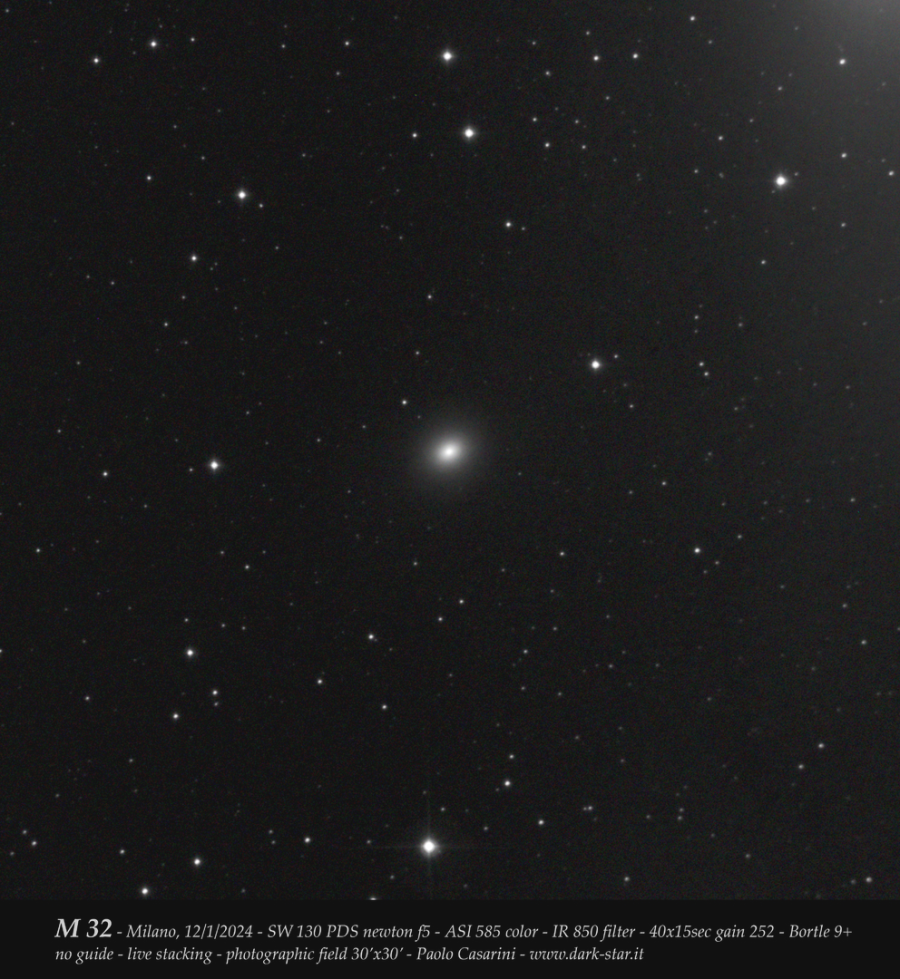 Interessante anche la resa sulla compagna principale della grande galassia di Andromeda, M32, ripresa tra le nuvole con una risibile integrazione di 40x15 secondi (dieci minuti). Nel fotogramma emerge prepotente l’alone esterno di M31 (in alto a destra). Link Astrobin: https://www.astrobin.com/d2ru6h/